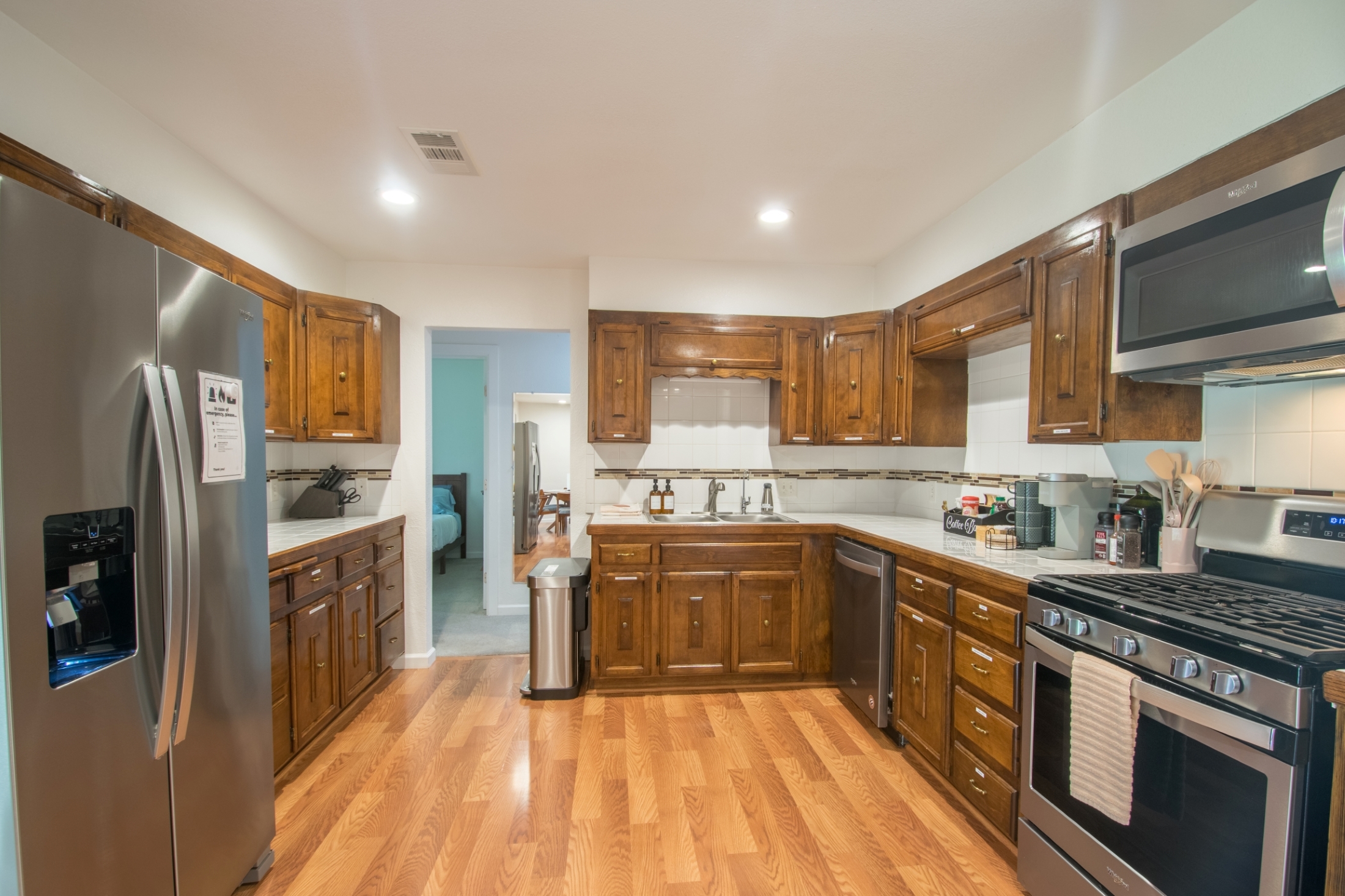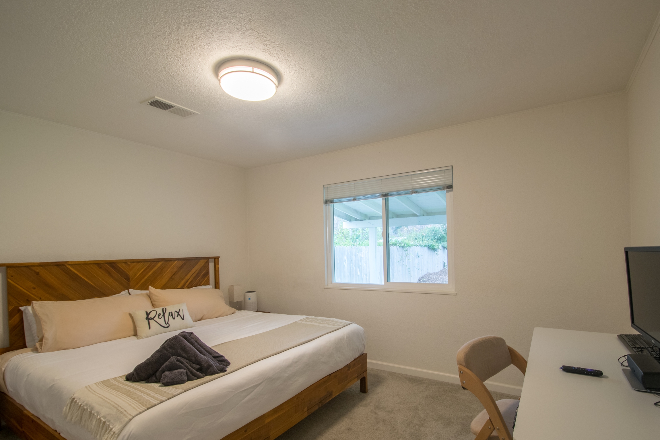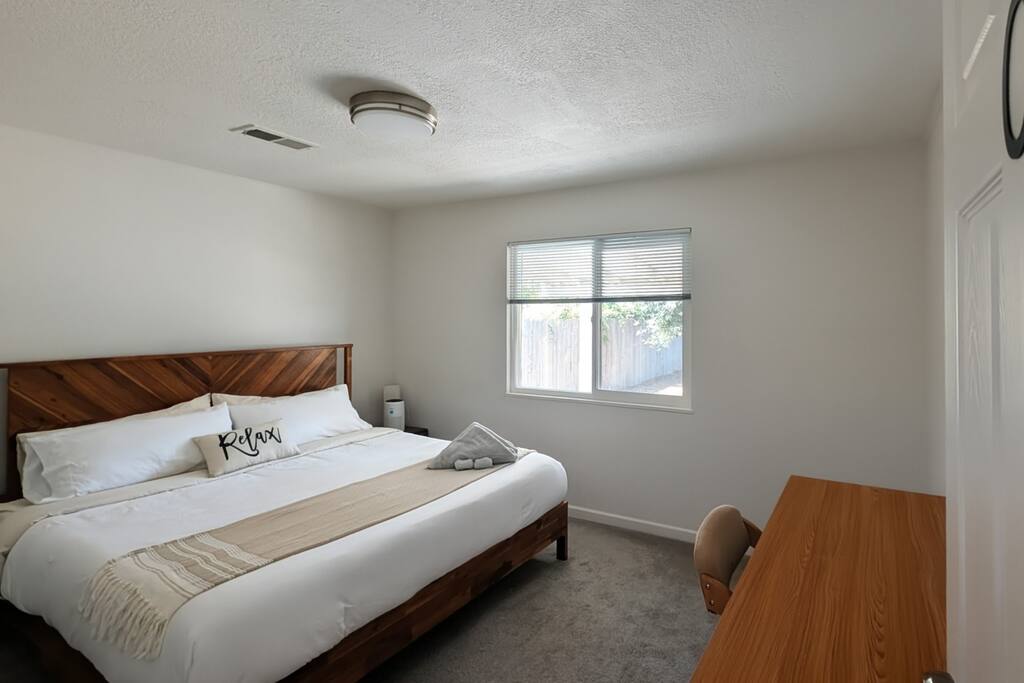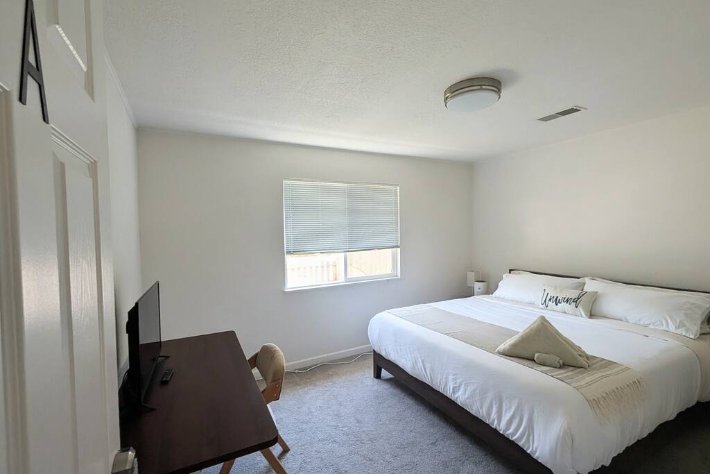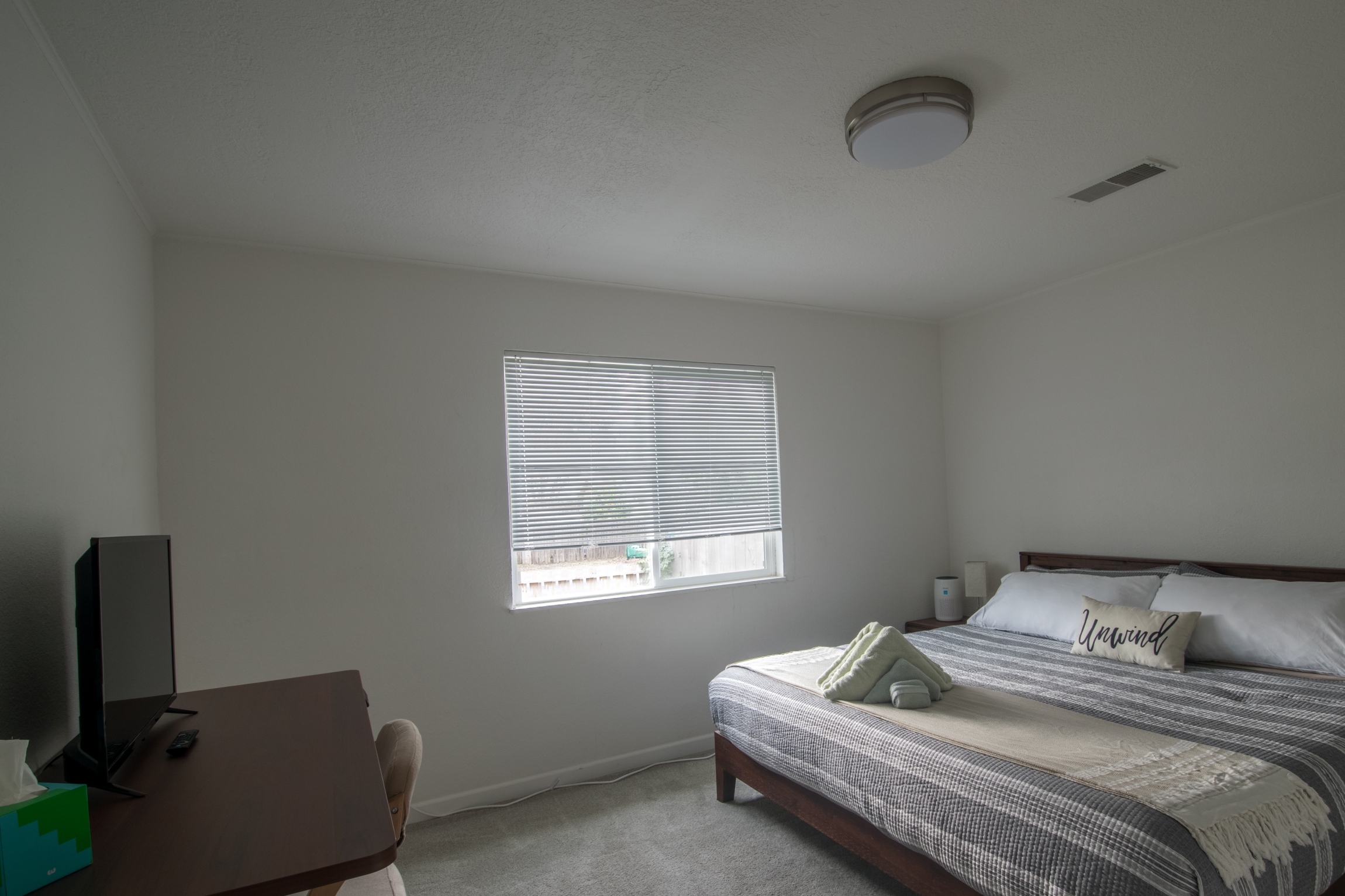 This spacious 4BD/2BA comes packed with amazing multifunctional features that will help you feel right at home. For the traveling workers: All bedrooms come equipped with a Kwikset smart lock for added privacy and security if you're traveling as a group of individual workers, and they can easily be disabled when you're traveling with family and friends. Whether you prefer a 12-cup carafe, a single-serve K-pod, coffee over ice, or hot tea, our Ninja DualBrew Pro coffeemaker can make whatever you need to fuel your day. All bedroom window shades are now upgraded to dual day/night shades--sleep in with the blackout shades or enjoy your privacy while allowing lots of natural light into the bedrooms! Each bedroom also has a HEPA air filter. All room chairs are foldable and can be used to add additional seating to the dining table, living room, or backyard so everyone can sit together in the home. The living room contains a 65" Smart TV for all your group entertainment needs. For our families traveling with little ones, we also can provide a travel crib and high chairs upon request for babies and infants--please inquire for more information! Last but certainly not least, our kitchen is fully equipped with a gas stovetop & oven, built-in microwave, dishwasher, garbage disposal, full size refrigerator, colanders, large mixing bowls, dinnerware & wine set for 8, cooking utensils, coffee machine, toaster, blender, and electric water boiler. We've got a Blackstone Griddle with built-in air fryer baskets. We've got plenty of pots, pans, bakeware, griddle tools, spices--perfect for those who love to cook while they're here. Our backyard is fully fenced for privacy, and we've got a grassy lawn and privacy hedge in the front. Whether your group members want individual privacy or togetherness on the property, we've got you.