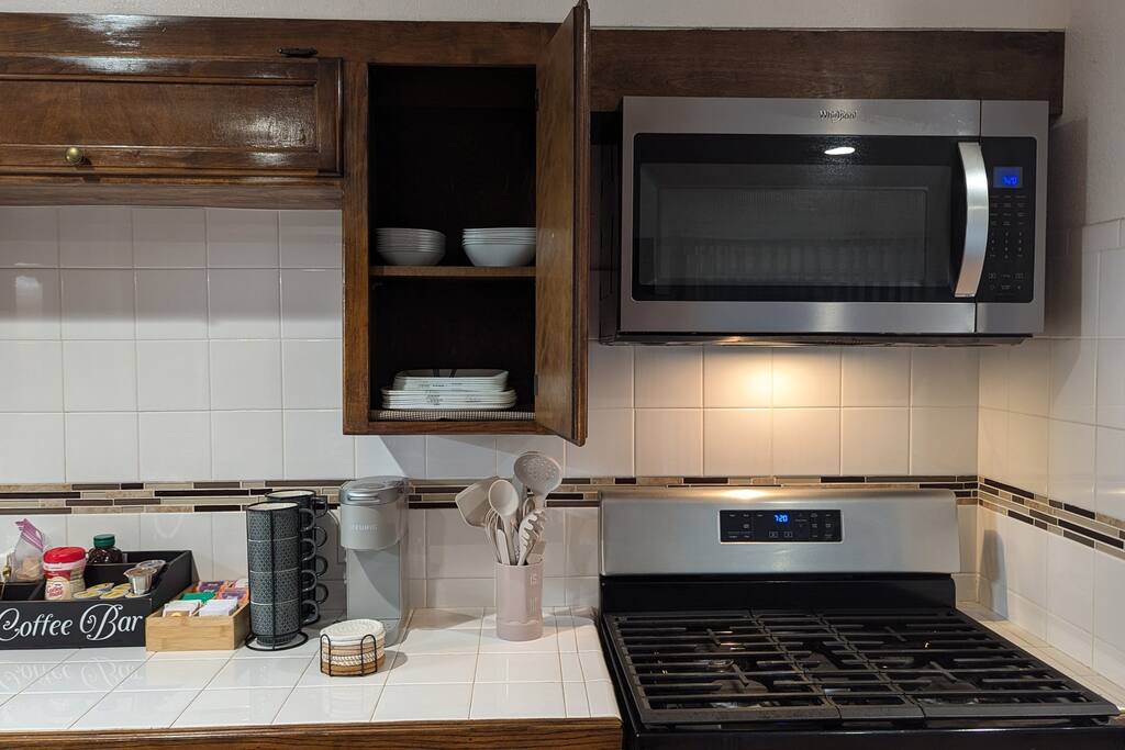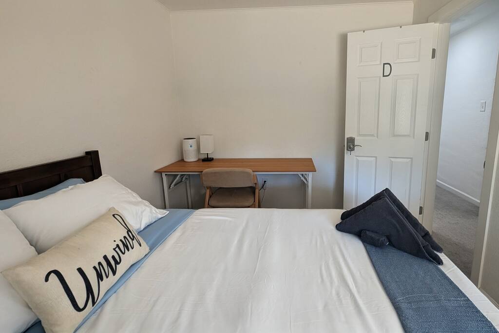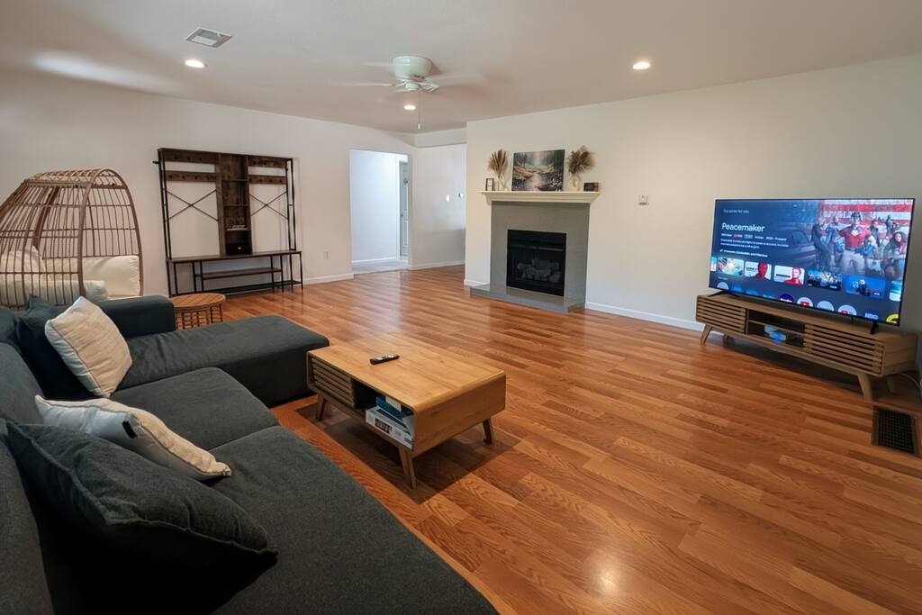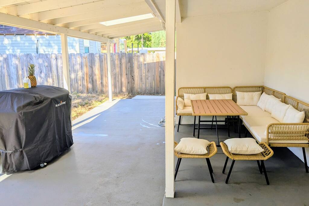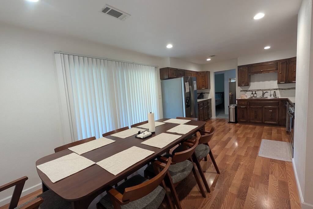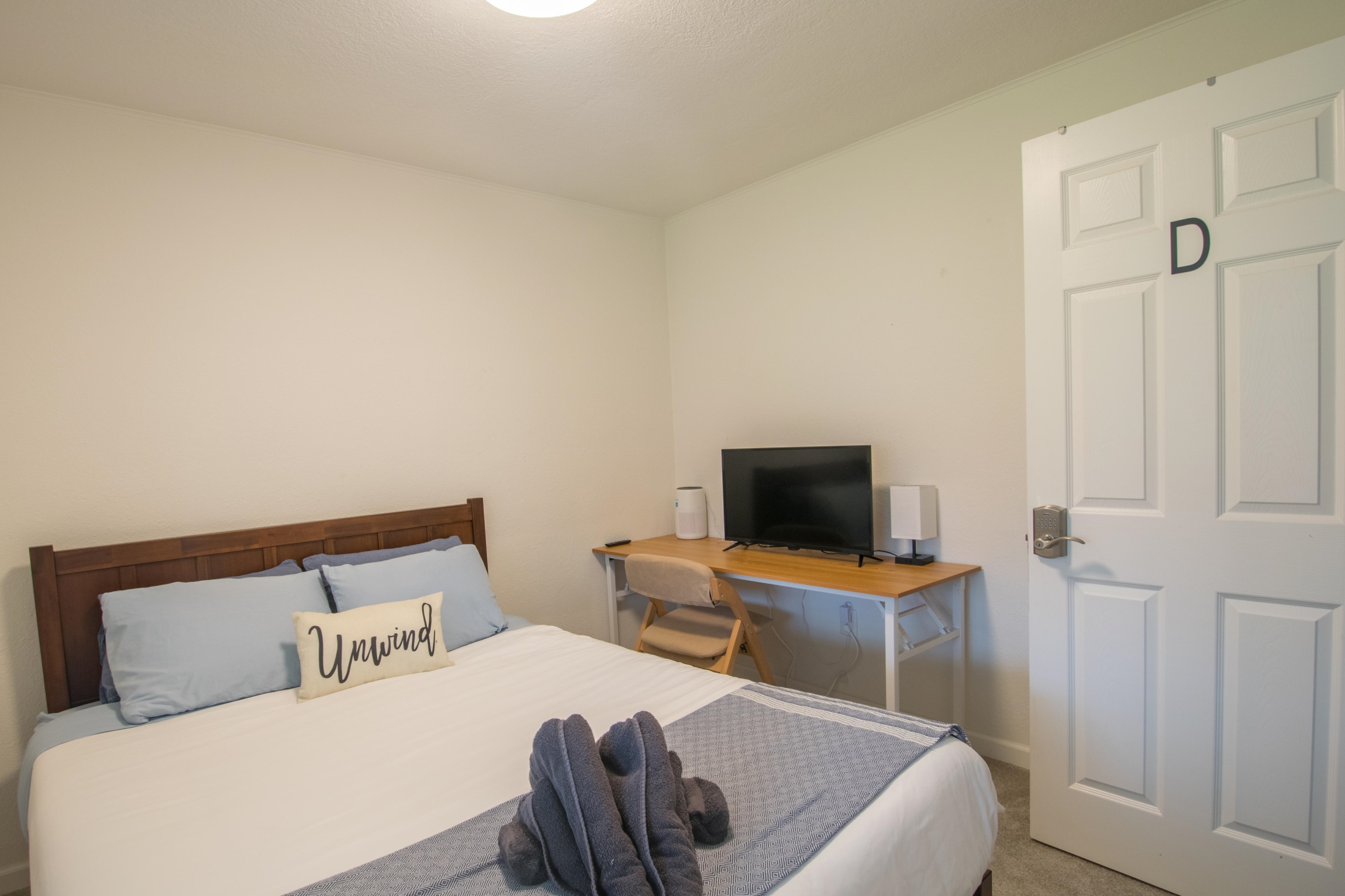 This spacious 4BD/2BA comes packed with amazing multifunctional features that will help you feel right at home. For the traveling workers: All bedrooms come equipped with a Kwikset smart lock for added privacy and security if you're traveling as a group of individual workers, and they can easily be disabled when you're traveling with family and friends. Whether you prefer a 12-cup carafe, a single-serve K-pod, coffee over ice, or hot tea, our Ninja DualBrew Pro coffeemaker can make whatever you need to fuel your day. All bedroom window shades are now upgraded to dual day/night shades--sleep in with the blackout shades or enjoy your privacy while allowing lots of natural light into the bedrooms! Each bedroom also has a HEPA air filter. All room chairs are foldable and can be used to add additional seating to the dining table, living room, or backyard so everyone can sit together in the home. The living room contains a 65" Smart TV for all your group entertainment needs. For our families traveling with little ones, we also can provide a travel crib and high chairs upon request for babies and infants--please inquire for more information! Last but certainly not least, our kitchen is fully equipped with a gas stovetop & oven, built-in microwave, dishwasher, garbage disposal, full size refrigerator, colanders, large mixing bowls, dinnerware & wine set for 8, cooking utensils, coffee machine, toaster, blender, and electric water boiler. We've got a Blackstone Griddle with built-in air fryer baskets. We've got plenty of pots, pans, bakeware, griddle tools, spices--perfect for those who love to cook while they're here. Our backyard is fully fenced for privacy, and we've got a grassy lawn and privacy hedge in the front. Whether your group members want individual privacy or togetherness on the property, we've got you.